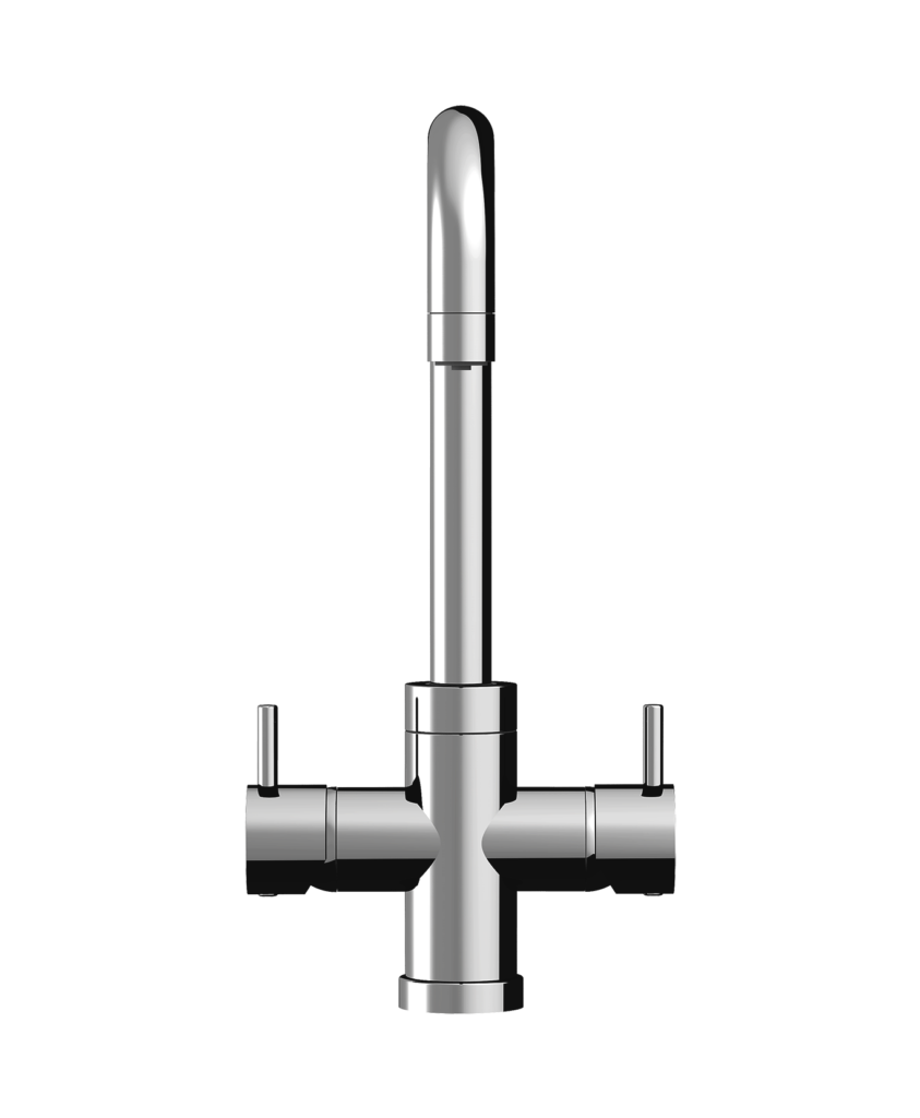 With a specially designed kitchen tap, this solution allows you to combine the regular cold and hot water function in one knob, while you can dispense filtered and chilled water, with or without carbonation, from the other knob.